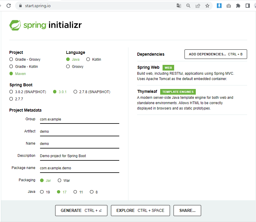 1. Spring Initializer 페이지에서 프로젝트 골격을 만든다. 브라우저에서 https://start.spring.io/ 주소를 입력하여 연결한다. 왼쪽에서 프로젝트 관리 툴, 개발 언어, 자바 버전 등을 선택한다. 우측 상단의 Add Dependencies 에서 추가하고 싶은 모듈들을 선택한다. 모두 선택했으면 하단의 Generate 버튼을 눌러서 프로젝트 뼈대를 생성 및 다운로드 받는다. 이 때, demo.zip 파일을 다운 받게 된다. ※ 여기서는 Maven, Java, Spring Boot 3.01 로 프로젝트를 선택하고, 요소로는 Spring Web과 ThymeLeaf를 선택해서 뼈대를 만든다. 패키지는 Jar 와 War 중에서 선택할 수 있는데, Jar로 만들게 되면 내장된 tomc..